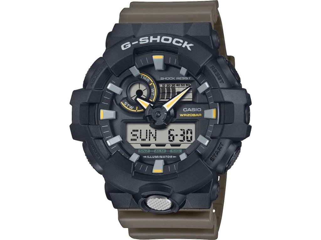 Casio G-Shock GA 710TU-1A3 mají kombinovaný číselník (analogový a digitální), který zobrazuje datum, den v týdnu, stopky, budík a další vybrané funkce. Číselník chrání minerální sklíčko. Pro snadnou čitelnost při zhoršených světelných podmínkách jsou ručky hodinek opatřené luminiscencí a nechybí samozřejmě ani LED osvětlení displeje. Černé barvy, malé oděrky na displeji, bez krabice.
