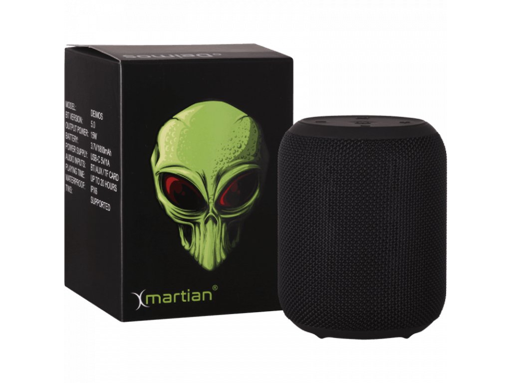 Skvělý bezdrátový reproduktor Xmartian Deimos. Dlouhá výdrž na baterii, vysoký hudební výkon a voděodolné provedení.Jako vstup hudby lze zvolit přehrávání z paměťových SD karet, 3,5mm jacku nebo bezdrátově pomocí bluetooth, 15W, černé barvy, používaný, pěkný stav , součástí je kabel a krabice.